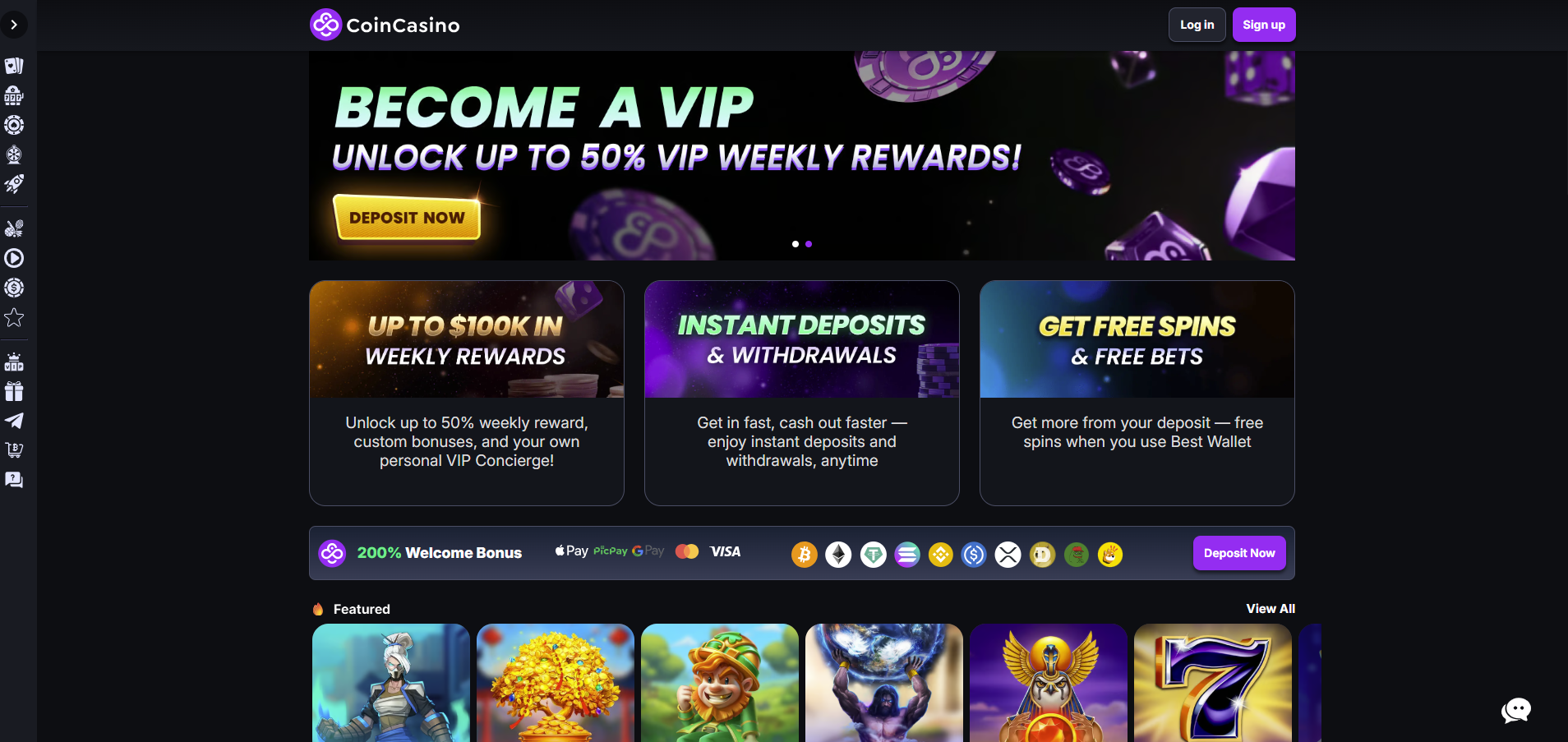 CoinCasino200% up to $30,000 + 50 Super Spins~₹830Instant to 2 hoursAnjouan