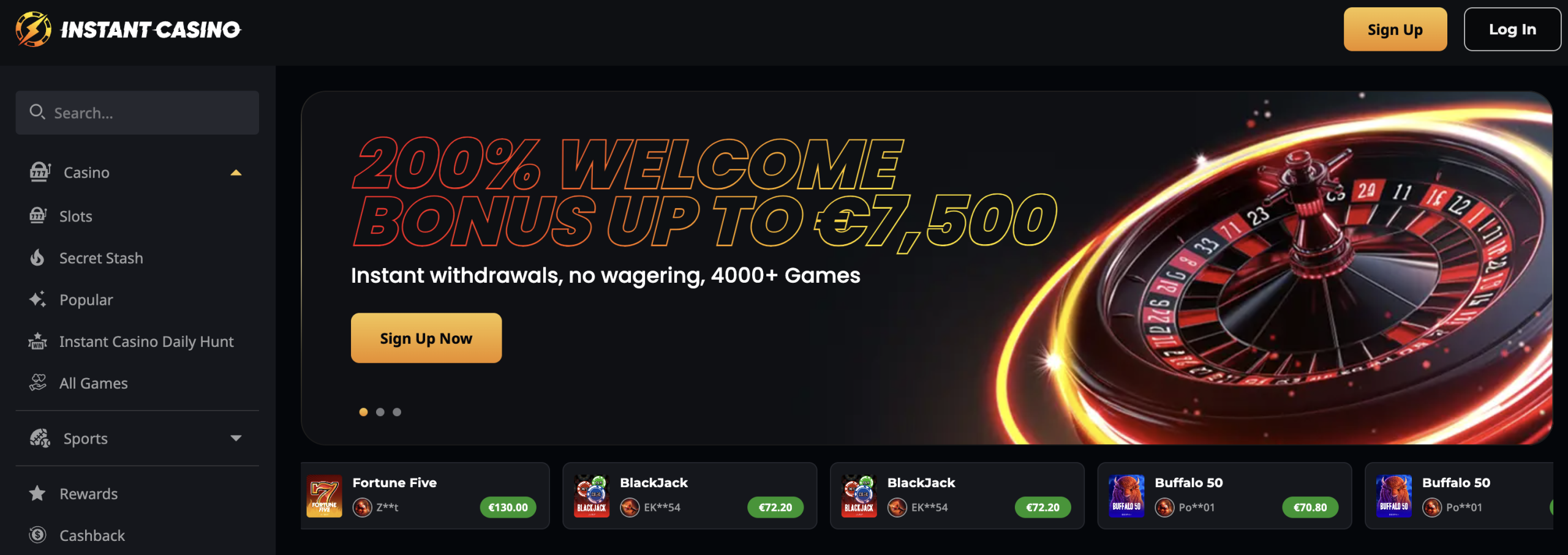 Instant Casino200% up to $7,500 + 10% weekly cashback~₹1,800InstantCuracao, Anjouan